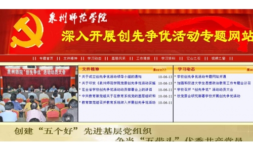 网站设置了文件精神、学习动态、基层风采、工作简报、学习资料等七个栏目,将综合运用文字、图片等形式,全面宣传党中央、省委及全省学校创先争优活动领导小组办公室关于创先争优活动的指示精神,及时报道学校各党总支、党支部创先争优活动的进展情况、先进典型成功经验和实际效果,是集信息发布、成果展示于一体的网上平台。