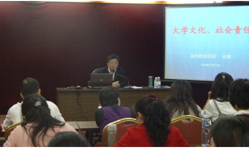 赵捷阐述了“大学的内涵”、“大学的使命”、“大学的文化”、“大学的责任”和“大学的价值”等问题,强调大学是现代社会的精神家园。他指出,作为大学教师,要始终坚守并努力践行大学的使命,实现自我价值;作为大学教师,要用爱和宽容引导学生追求生活中的真、善、美,要教学生学会做人、学会生存、学会学习,努力把学生培养成有素质、有气质、有教养的好公民。最后,赵捷对青年教师提出六点要求:一要知道大学之所以为大学;二要明白教师是大学的第一资源;三要牢记追求真理是大学教师的基本素质;四要理解大学教育是“开发”学生智力,不是“灌输”知识;五要清楚大学校园是精神家园,不是商品市场;六要深信受尊重的大学教师是靠道德、知识、创造。