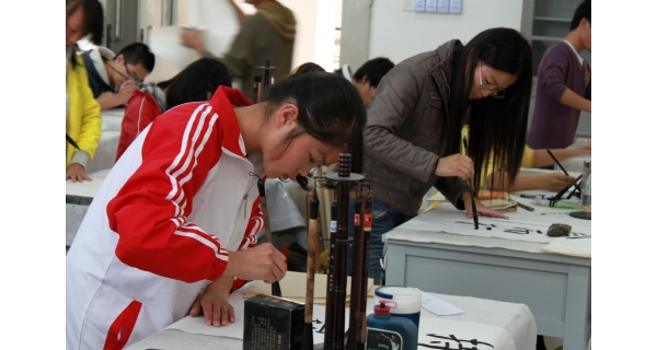 经过两个小时的细心雕啄,一幅幅精美的书法作品被悬挂展示。书法专业老师亲临现场指导示范,并从整体气息、粗细比例、黑白对比、字体大小等专业角度对作品作出点评。最终,苏建苹、陈晓清、郑炜琳等同学的14幅作品入围。