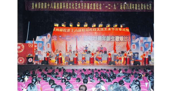 开幕式后,举行新生歌咏比赛。14支代表队参加了比赛。正值12月9日,我校学子以歌咏的方式铭记历史,纪念“一二·九”运动75周年。大合唱中同学们不仅歌声嘹亮,情绪饱满,还创意地加入快板儿、舞蹈、朗诵等形式,促进情感的进一步表达。最后,教科学院、政发学院荣获一等奖,外国语学院、文传学院和化生学院共同获得二等奖,另外九个学院获得三等奖。音乐舞蹈学院获得最佳表演奖。