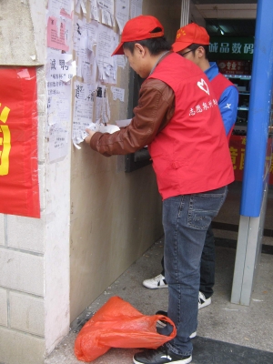 当日下午,志愿者们对食堂出入口、校主干道及宣传栏等广告乱粘贴现象严重的地方进行了清理。据负责人介绍,由于长期反复的张贴堆积,志愿者们缺乏足够的工具,又逢返校当天志愿者人数较少等原因,给清理工作带来了困难。但志愿者们干得热火朝天,细心地清除了墙上乱张贴的广告。同时校青年志愿者协会将与各二级学院协同成立志愿劝导队,对校内乱张贴广告现象进行监督。