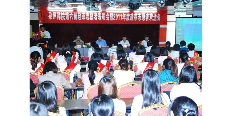 5月25日上午,我校举行第六批赴菲志愿者表彰会暨2011年度赴菲志愿者欢送会。党委书记赵捷、副书记张舟、副校长高云程,志愿者工作领导小组全体成员,2010年和2011年赴菲志愿者及师生代表参加了会议。高云程副校长宣读表彰名单,外事办主任耿永泉主持会议。