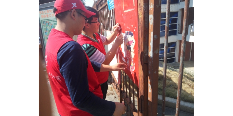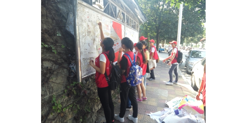 中午12点30分,十二个学院的志愿者于三餐门口集合,穿戴好志愿者服装,由各院负责人分配好清洗工具,志愿者或拿着抹布或带着小刀,由校青的两位负责人带队将志愿者们分成两队以三餐为起点沿校道分头行动。同时,各学院以学院所在的教学楼为中心进行打扫及清理。志愿者们开始的时候,不敢放开地做,生怕会把一些有用的材料给撕了。慢慢地在负责人的指导下,大家也就清楚了该怎么做,能把校道两边的宣传栏电线杆甚至是地面上的一些没必要出现广告清除得干干净净。能用手撕的用手撕,由于部分海报比较不好撕,同学们都用手中的小刀将其清除;校道边上也还有许多的条幅需要清除,志愿者们更是做足了准备,带了剪刀和钳子,解决一些绑条幅的绳子和铁线。中午的太阳还是比较大的,天气炎热,但志愿者还是坚持认真完成分配的任务。