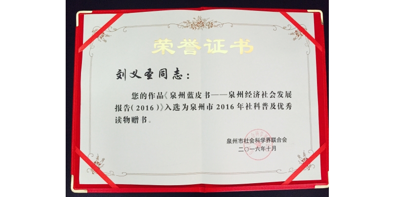 刘义圣教授主编的《泉州蓝皮书——泉州经济社会发展报告(2016)》,得到了泉州市委市政府的认可与肯定,并入选为泉州市2016年社科普及优秀读物赠书。该书积极为泉州市经济社会发展建言献策,为打造“创新泉州、智造泉州、海丝泉州、美丽泉州、幸福泉州”贡献力量。