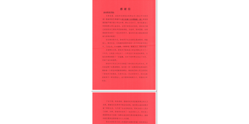 感谢信中提到,在寒冷的冬天,次仁达措同学以及她的志愿团队充分发挥志愿者奉献爱心、服务社会的精神,为当地小学生和群众补习文化知识,开拓视野。让他们过了一个充实又有收获的假期,为这个春节增添了一份温馨。他们用行动彰显了新时代大学生的本色,用行动诠释了志愿者精神,深深地感染着巴青的每一个学生和受教育的群众。号召巴青县学生将来也像我校志愿者一样关爱他人,成为国家栋梁之才,回报家乡和社会。