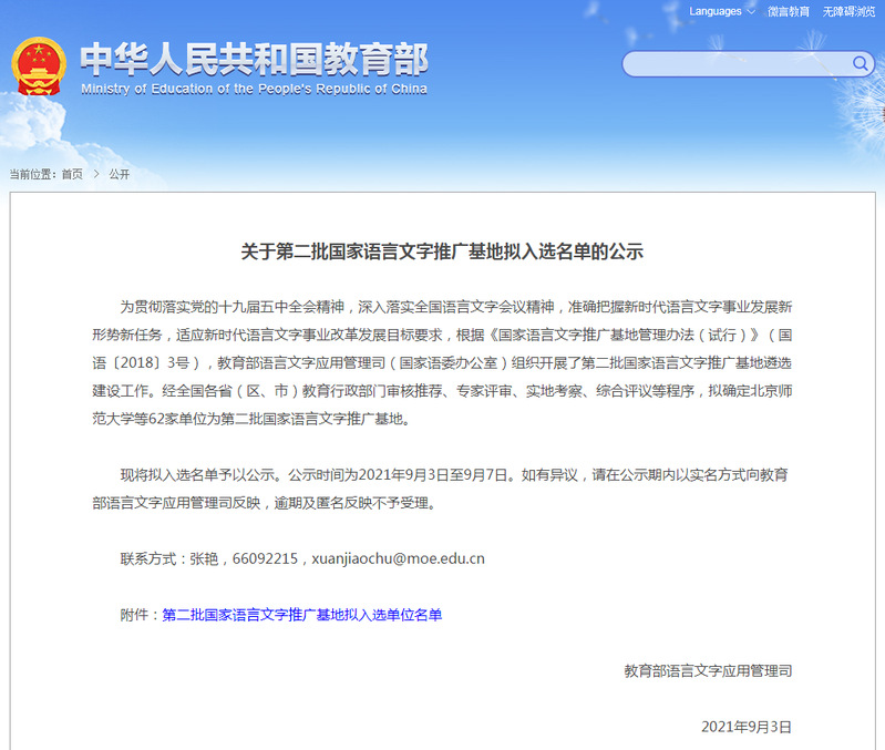关于第二批国家语言文字推广基地拟入选名单的公示