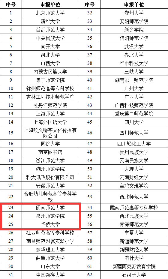 近日,教育部网站发布《关于第二批国家语言文字推广基地拟入选名单的公示》,拟确定北京师范大学等62家单位为第二批国家语言文字推广基地。其中,福建3所高校入选,分别是华侨大学、泉州师范学院和闽南师范大学。