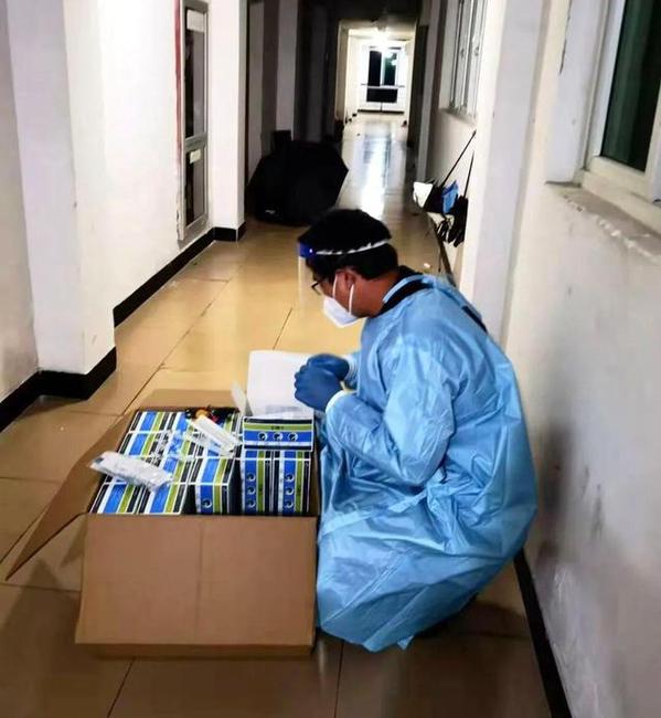 穿好防护设备已是凌晨00:10,“大白”们分组奔赴学生ABC三个宿舍区,分发抗原自测试剂。雨越下越大,穿梭于各栋楼间分发试剂的老师们顾不上拿雨具。分发完试剂,回到办公室已是凌晨2点多了,但老师们已顾不上全身湿透,累得倒头便睡。