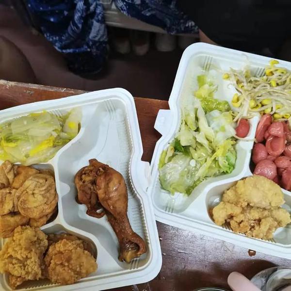 12点,丁燕妮和同事们又拉着沉重的餐盒,把午餐送到门口,“我们怀着拆盲盒的期待去拆午餐,今天中午是,鸡腿肉,青菜,肉丸还有煎蛋。”陈祥龙说。午饭过后,他会听听歌,洗一洗衣服。