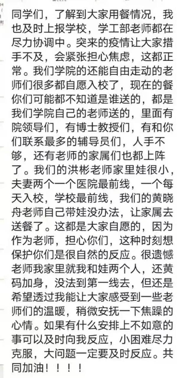在泉州师范学院,外国语学院组织了一支由17名行政人员和专任教师组成的送餐队伍,住进学院,每日为3栋宿舍楼近千名学生送餐。教师还自掏腰包,为学生购买方便面750杯。为满足多样化需求,联系学校超市,以宿舍为单位,线上下单、超市打包,老师上门配送。因为女生多,外国语学院还专门购置了700包卫生巾,满足女生的需求。