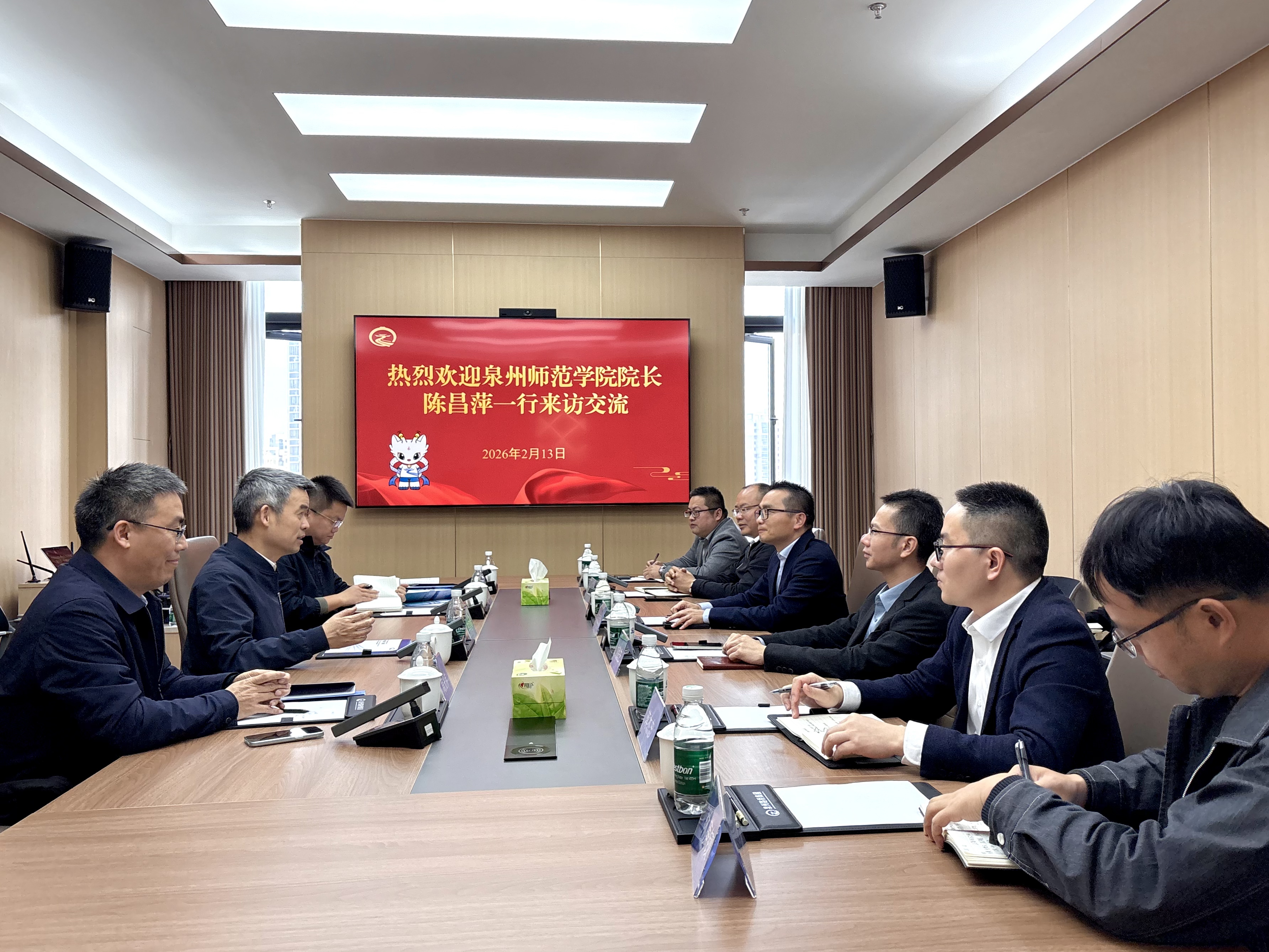 在泉州交发集团,洪冬青介绍了交发集团有关情况,表示双方合作基础良好,期待拓宽合作广度、加深合作深度,实现互利共赢。陈昌萍介绍了学校办学特色,以及“十五五”发展思路,向泉州交发集团对学校建设发展的支持表示感谢。双方就进一步推动校企人才互通、人才培养定制化、科研成果产业化等方面进行深入交流。