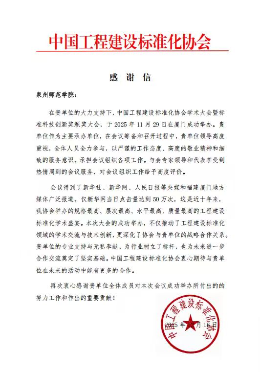 近日,中国工程建设标准化协会向我校发来感谢信,对我校主办2025年度中国工程建设标准化协会学术大会暨工程建设标准科技创新奖颁奖大会所承担的各项工作表示感谢。