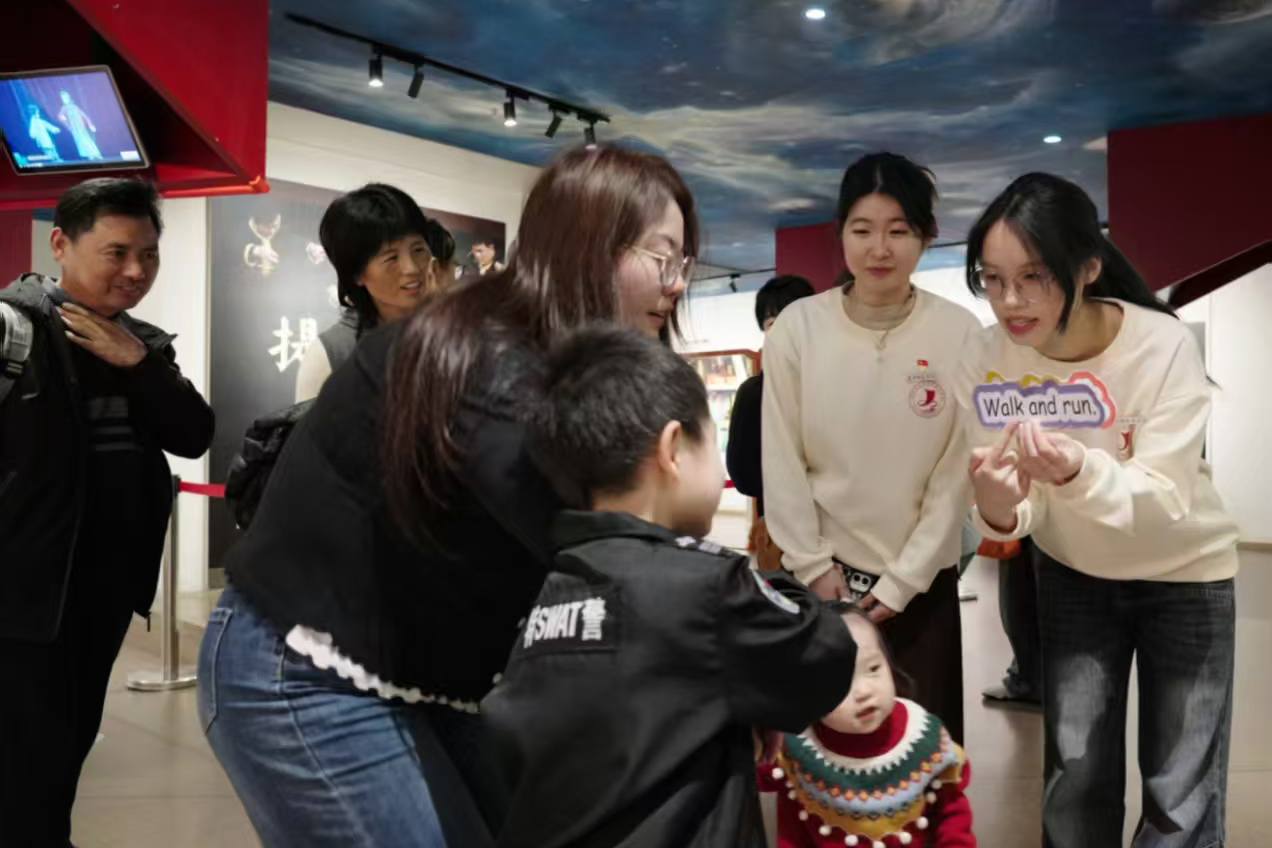 外国语学院“海丝驿站”实践队在泉州非物质文化遗产馆,用英语介绍提线木偶