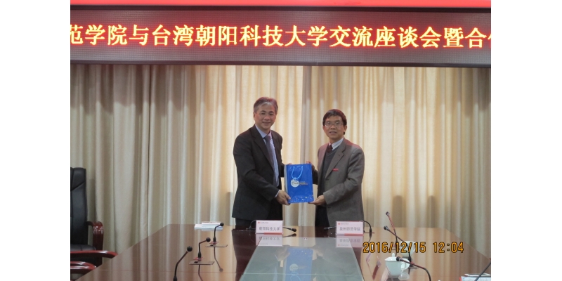 会上,李清彪校长对客人的到来表示诚挚的欢迎,他说,学校正致力于转型发展,原有师范教育有较好的基础,但希望能借助像朝阳科技大学这类以理工科见长的学校的办学经验和优势,促进学校转型发展,今后希望主要从学生交流项目、教师进修、联合申报科研项目、推荐优秀博士来校工作等几方面开展实质性的合作。郑道明校长详细地介绍了朝阳科技大学的办学特色以及校务管理研究和培训的独到经验,希望能够充分发挥各自学校的优势,推进两校间的交流合作。