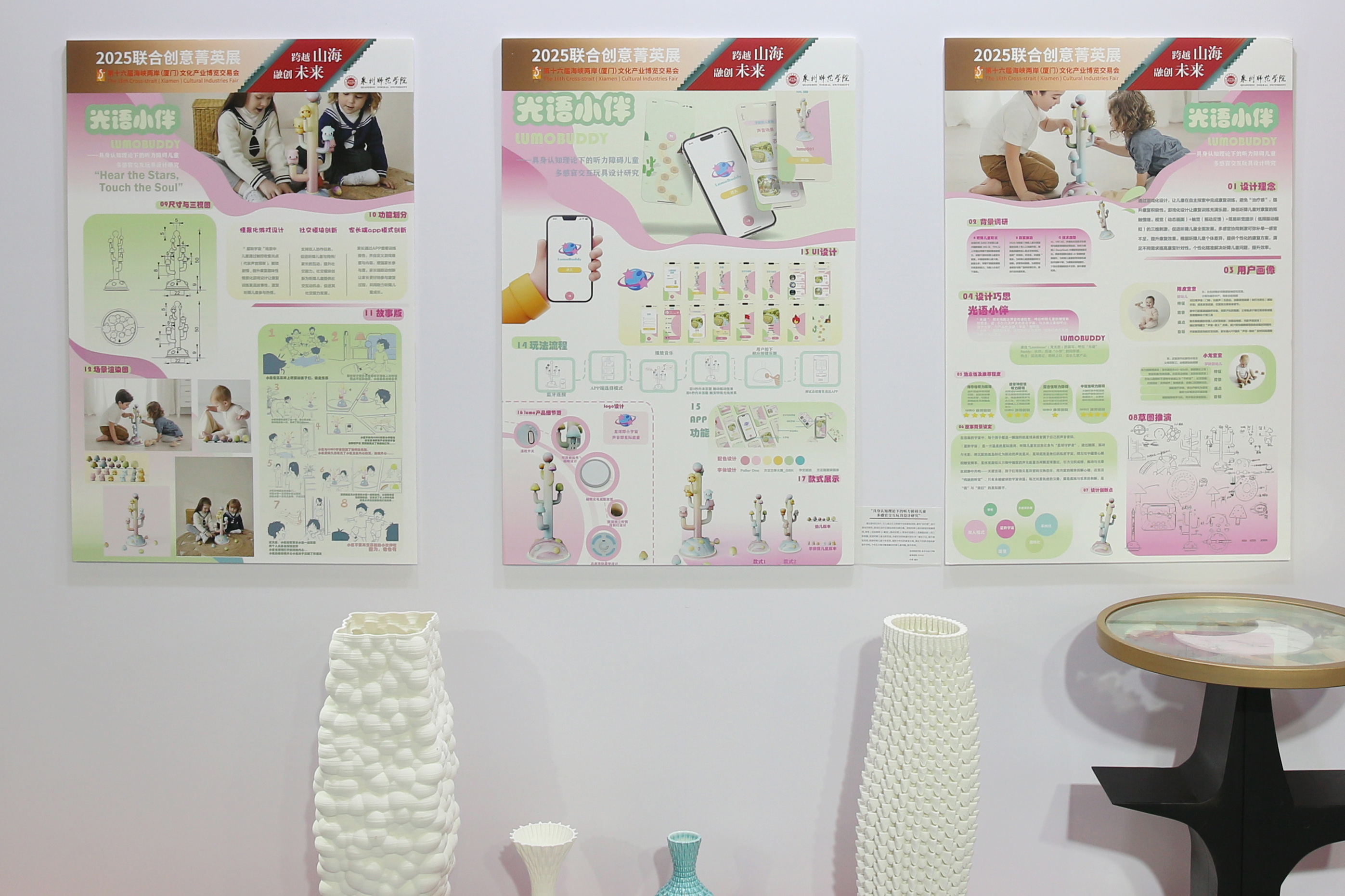 展会期间,组委会还举办“跨越山海·融创未来”2025联合创意菁英展,我校《基于情感化设计的宠物交互智能设备——聆宠》《具身认知理论下的听力障碍儿童多感官交互玩具设计研究——光语小伴》等产品设计作品入选,吸引了众多领导嘉宾和游客参观。
