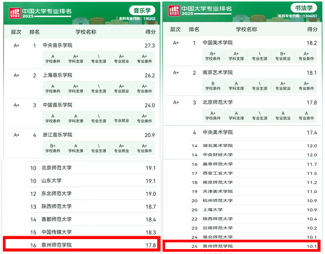 音乐学、书法学专业在2025软科中国大学专业排名中分别获评A档和B+档