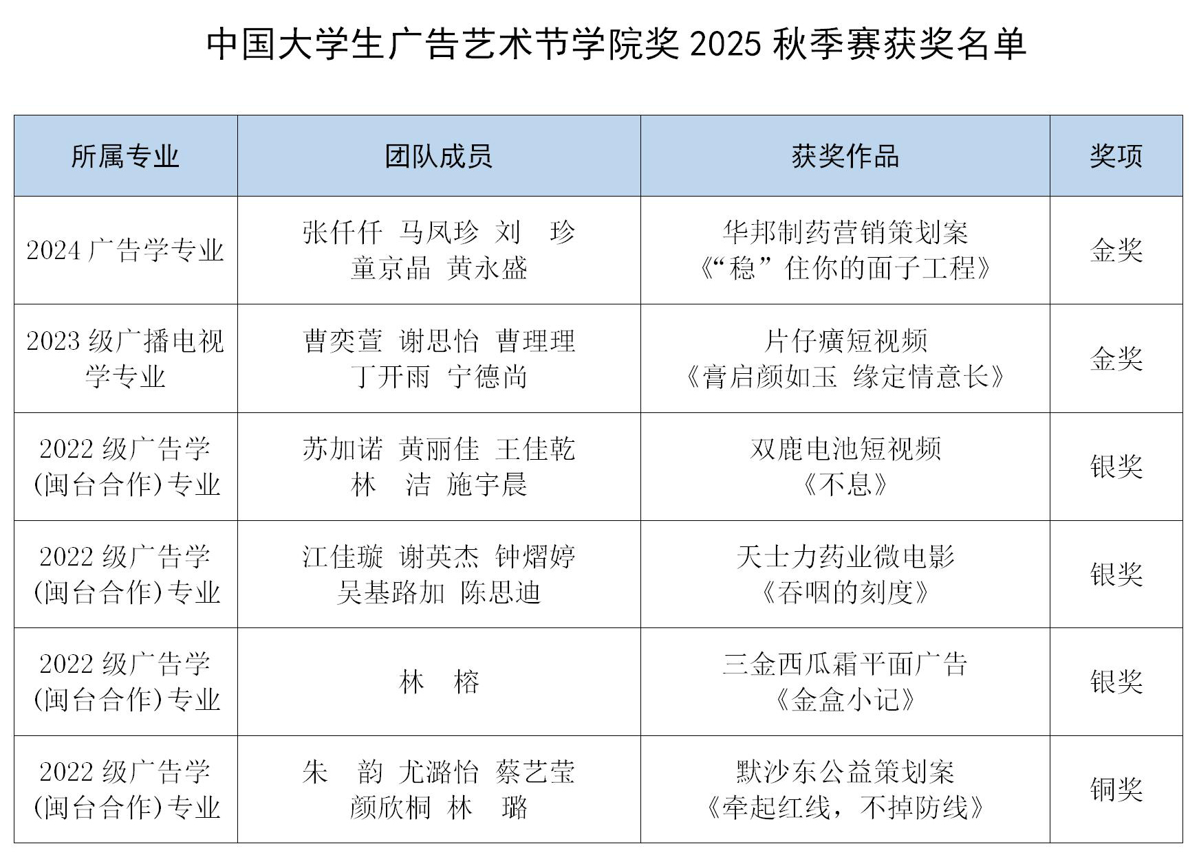 中国大学生广告艺术节学院奖是经国家市场监督管理总局批准、由中国广告协会主办的全国大型大学生广告艺术类赛事,被誉为中国广告教育界的“奥斯卡”。本届秋季赛吸引全国1800余所高校参与,征集参赛作品超40万件,赛事规模与专业水准兼具,竞争激烈。(文学与传播学院)