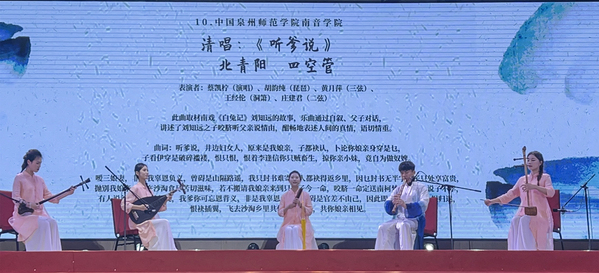 With the theme of "An Encounter Born of Nanyin", the teachers and students of our university performed a cappella version of the Nanyin piece Listening to Father’s Words. They also co-performed classic Nanyin works such as Walking to the Pavilion, The Final Three Refrains and Wind Blowing Pear Blossoms with Nanyin artists from home and abroad. Their exquisite performances showcased the unique charm of Nanyin art and won wide praise from the guests present.