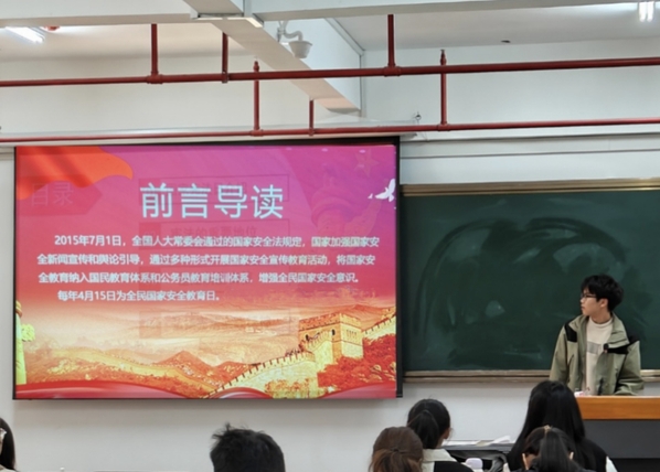 各团支部以“团课+研讨”形式展开学习。在主题团课上,各班团支书通过播放生动形象的视频短片,向同学们介绍了总体国家安全的丰富内涵和重要意义。从政治安全到国土安全,从经济安全到文化安全,一个个鲜活的案例让同学们深刻认识到国家安全与每个人息息相关,并非遥不可及的抽象概念。团支书们还结合《国家安全法》《反间谍法》等内容,系统阐释总体国家安全观的内涵与意义,并通过案例分析强调生物安全、科技安全等非传统安全领域的重要性。