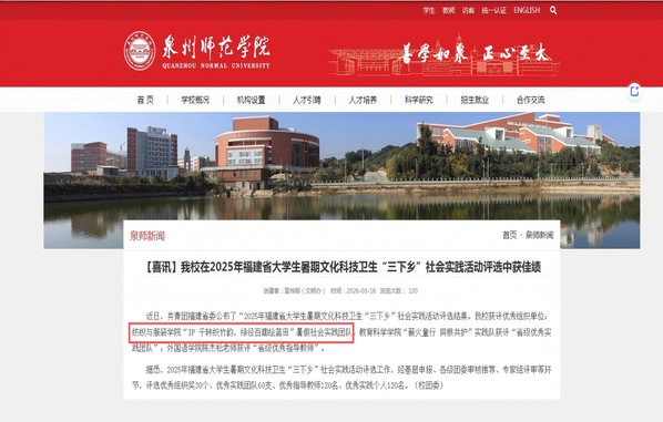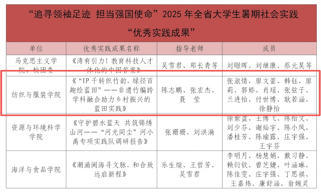 近日,共青团福建省委公布了2025年福建省大学生暑期文化科技卫生“三下乡”社会实践活动评选结果,纺织与服装学院“IP 千转织竹韵,绿径百趣绘蓝田”暑假社会实践团队获评“省级优秀实践团队”。此外,在中共福建省委教育工委“追寻领袖足迹 担当强国使命”2025年全省大学生暑期社会实践活动评选结果中,学院调研报告《“IP千转织竹韵,绿径百趣绘蓝田”——非遗竹编跨学科融合助力乡村振兴的蓝田实践》获评“优秀实践成果”。