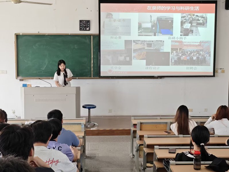 讲座中,林诺菲以“在泉师的学习与科研生活”为线索,向学弟学妹们展示了充实而多彩的大学图景:从作为科研小助手初窥学术门径、认真完成每一次课程设计,到2021年首次踏上“光电竞赛”的征程。她特别分享了“疫情下的考研与竞赛”这段特殊经历,讲述了如何在压力下平衡备考与项目攻关,并最终在2022年再次于光电竞赛中取得突破、成功考研的奋斗历程。她说,在泉师的每一步积累,都为后续的深造打下了坚实基础。