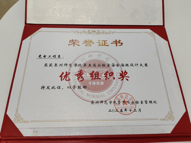 近日,泉州师范学院第五届实验室安全海报设计大赛评选结果揭晓,光电工程系在比赛中斩获多项个人奖项,荣获“优秀组织奖”。