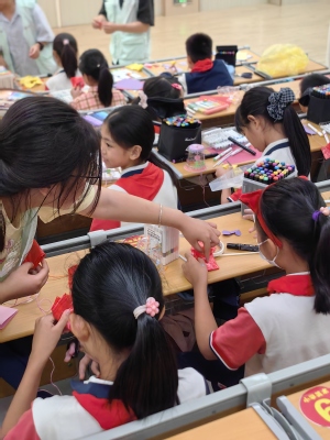 在制作彩色风铃环节,队员们先拆解“裁剪、染色、串挂”三大核心技法,再以“塑料瓶除了扔掉,还能变成什么”的提问引导发散思考,让孩子们直观理解“废弃物是放错地方的资源”。“‘塑’造繁花”环节更具巧思,在队员们的悉心指导下,孩子们将彩色塑料袋,通过剪、拧、扎等简单手法创意搭配,亲手打造出一朵朵形态各异、永不凋零的“塑料繁花”。在指尖创作的过程中,孩子们既锻炼了动手能力、创新思维与问题解决能力,更在动手实践中深化环保与节约意识,将“变废为宝”的理念自然内化为日常习惯;同时在发现美、创造美的过程里,真切感受到艺术与生活交融的独特魅力。