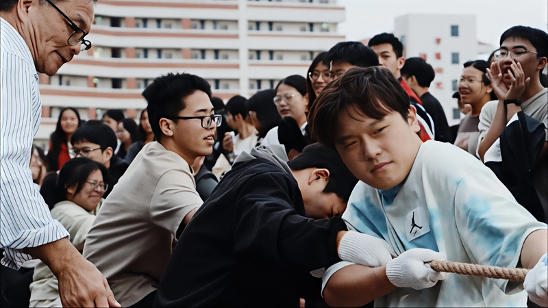 随后,随着裁判一声哨响,比赛正式拉开帷幕。师生队员们迅速进入状态,紧握长绳、重心后移、脚蹬实地,眼神坚定,气势如虹。“一二!一二!”的呐喊声整齐有力,响彻校园;场边助威团的加油声、欢呼声此起彼伏,与赛场上的拼搏身影交织成一幅生动的师生同心画卷。无论是沉稳干练的教职工,还是朝气蓬勃的学生,都全力以赴、咬牙坚持,每一次绳结的移动都牵动着在场所有人的心弦。