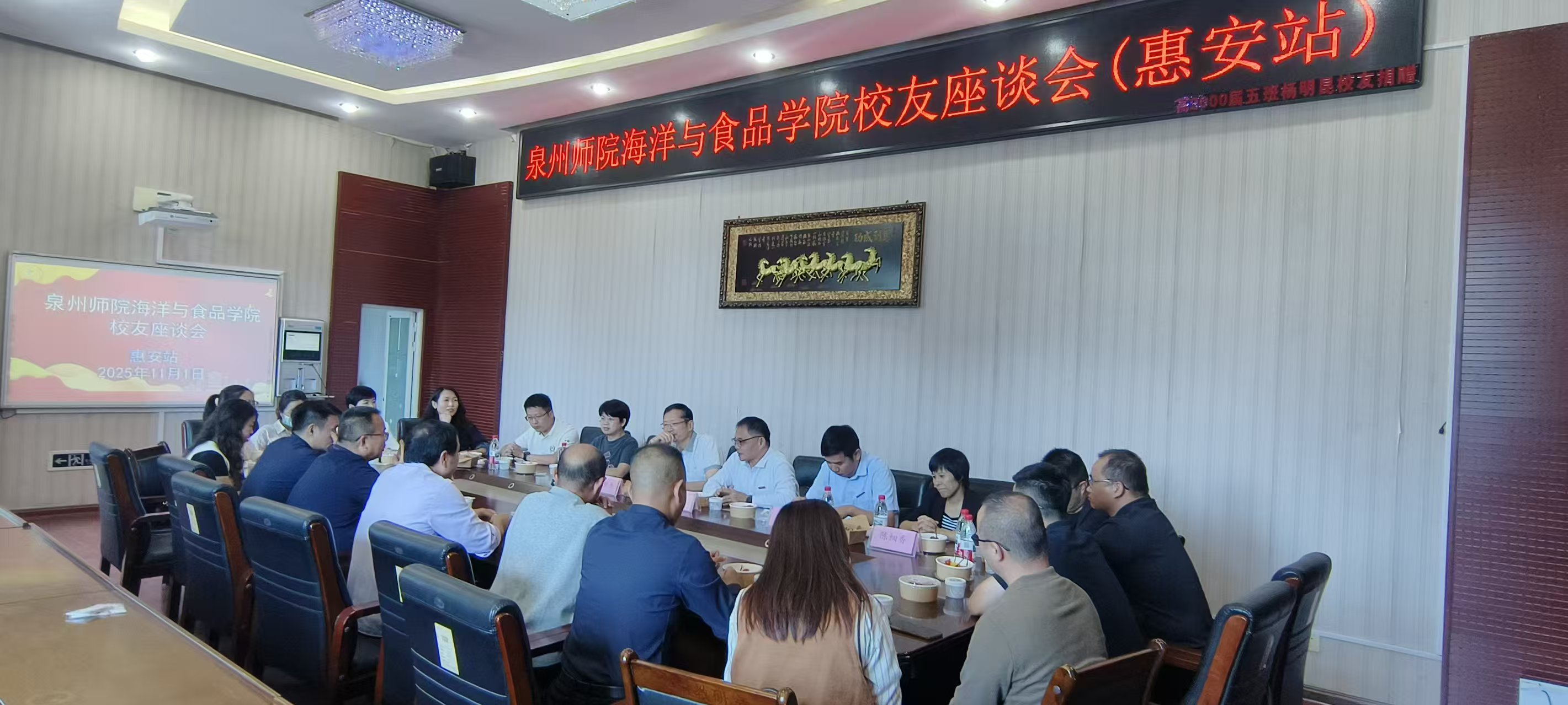 为紧密联结校友情谊,汇聚校友力量,11月1日,海洋与食品学院党委书记蔡志荣、副院长(主持工作)梁鹏、五级职员戴聪杰、生物科学系主任陈细香一行4人,专程前往惠安县,与来自涂寨镇政府、惠安县教育局、惠安一中、惠安三中、嘉惠中学、惠安高级中学、遇乐园景观工程有限公司等数十位各届优秀校友代表在嘉惠中学欢聚一堂,举行了一场温馨感人的校友座谈会。现场欢声笑语,情谊涌动,充满了重逢的喜悦与感动。座谈会由校友林育腾(2000级)主持。