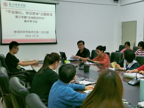 为持续推进“不忘初心、牢记使命”主题教育,10月25日,教育科学学院学生第二党支部在特教大楼A506会议室,围绕“主动担当作为”组织开展第三专题集中学习。支部书记张甲玉主持会议,支部党员、发展对象和积极分子参加。