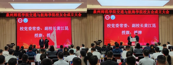 副校长黄江昆向交通与航海学院校友会授旗、授牌。