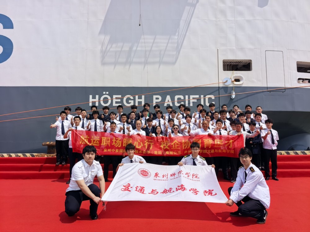 4月9日上午,交通与航海学院“温暖集体”建设重点项目“航运职场暖心行”活动走进泉州市石狮市石湖码头,组织46名中泉国际经济技术合作(集团)有限公司订单班学生及7名专业教师,参加礼诺太平洋号(HÖEGH PACIFIC)滚装船命名仪式暨实地研学活动。本次活动作为学院“温暖集体”建设的重要实践,旨在通过校企协同育人,破解学生对航运行业认知浅、职场衔接难等问题,切实提升学生职业素养与就业竞争力,让“温暖集体”建设在产教融合中走深走实。
