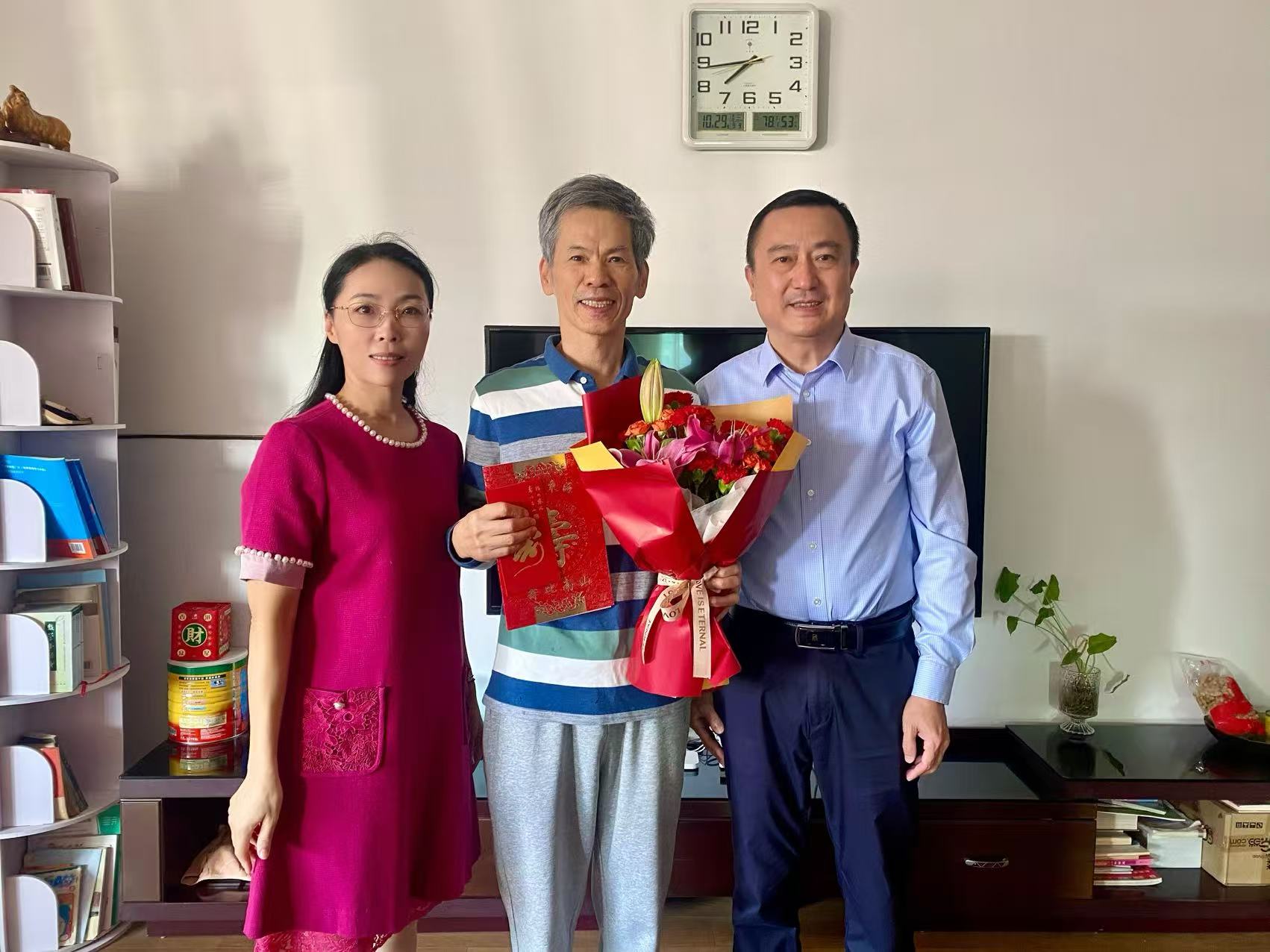 秋阳送暖,花香情浓。在重阳节来临之际,受校党委委托,校党委副书记林伟带队走访慰问了我校70、80、90岁老同志,代表学校向他们致以节日的诚挚问候和崇高敬意,并送上鲜花、贺卡及祝寿金。