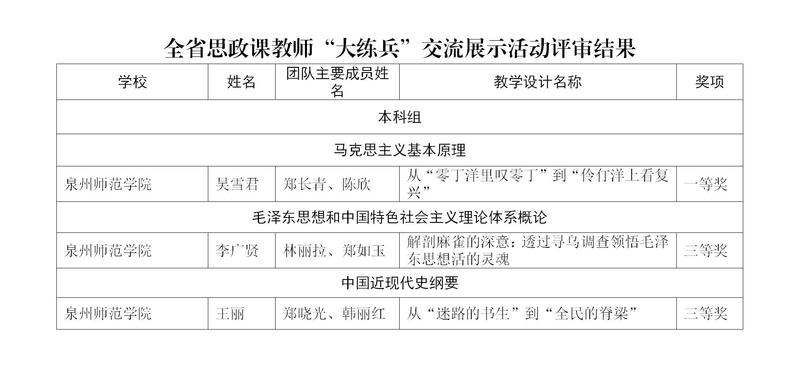日前,全省思政课教师“大练兵”交流展示活动结果揭晓,我校马克思主义学院教师吴雪君获本科组一等奖,王丽、李广贤获得本科组三等奖。