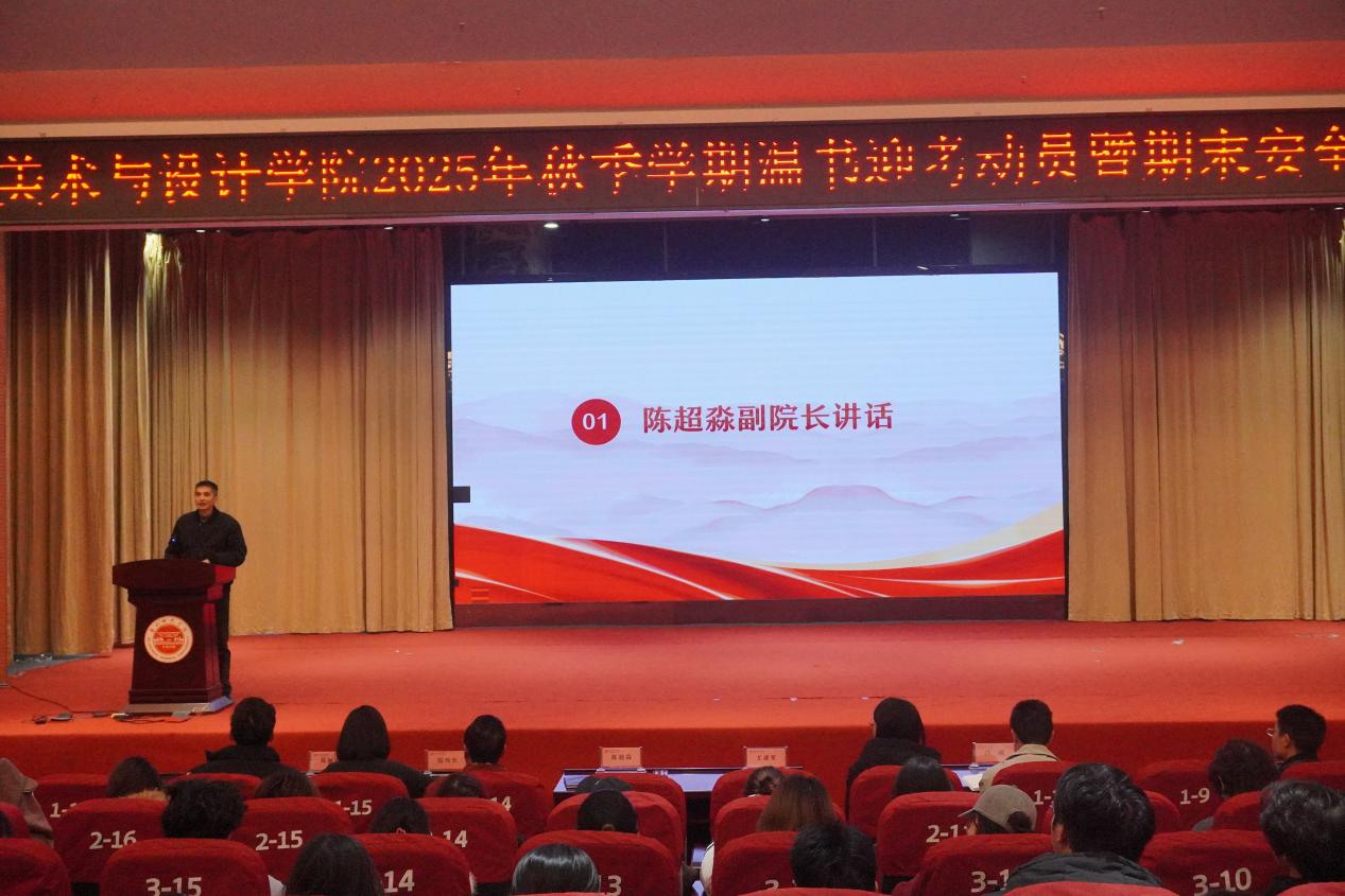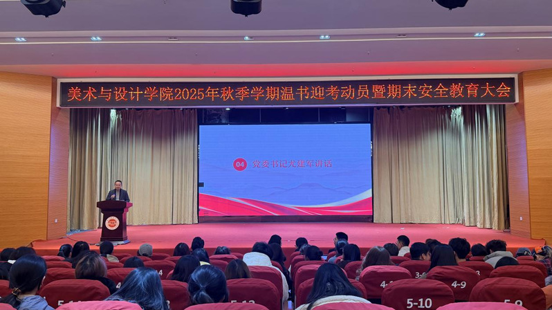 1月8日下午,美术与设计学院在特教大楼第一学术报告厅召开2025年秋季学期期末温书迎考动员暨安全教育大会。校党委学生工作部副部长白雅芬,学院党政领导,教学科研办负责人、全体辅导员和参加期末考试的在校学生参加。会议由学院党委书记尤建军主持。