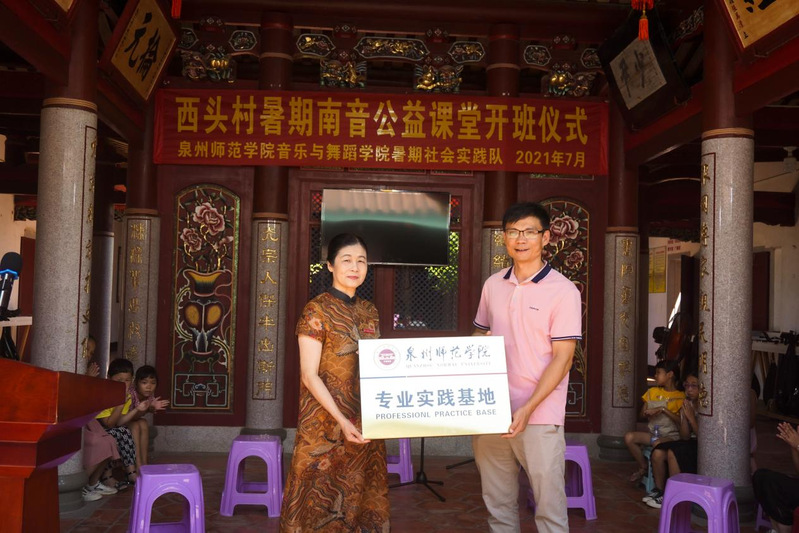 在7月13日的开班仪式上,原校党委副书记现泉州市教育基金会副理事长张舟、校团委书记刘显新、院党委书记苏国柱、南音系主任白志艺、惠安县关工委刘忠民主任、净峰镇党委组委吴泽祺等领导莅临关心指导,西头村党支部书记张钦强致欢迎辞,音乐与舞蹈学院院长王丹丹作讲话,并向西头村授予“泉州师院专业实践基地”。王丹丹院长嘱托实践队队员们通过本次社会实践活动向西头村的南音前辈们虚心请教、认真学习,在实践中熏陶思想、提升品德、增长才干、将所学专业知识教授予新一代南音文化传习者,获得丰富的教学、实践经验,身体力行地传承世界非遗、中华优秀传统文化——南音,并创新性地推广南音,希望丰富多彩的公益课堂和公益宣传活动能助力西头村的文化建设、为新农村建设、乡村振兴增光添彩。