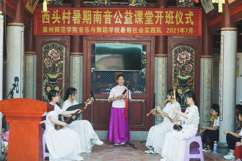 为引领学生在社会实践中受教育、长才干、作贡献,以实际行动投身乡村振兴战略实施,勇做担当民族复兴大任的时代新人,7月13日—7月18日,音乐与舞蹈学院“传承非遗新生代·南音推广小先锋”暑期社会实践队一行12人赴惠安县净峰镇西头村开展为期一周的社会实践活动,本次社会活动包含了南音公益课堂、南音社拜馆、南音公益快闪、环保宣传、校园安全宣传、党史宣传教育、汇报演出等丰富多彩的实践内容。