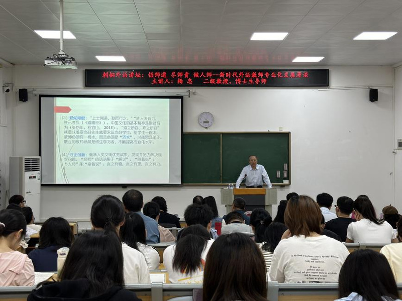 杨忠教授首先指出高质量的教育是中国式现代化的重要内涵。高质量教育发展依靠高水平的教师队伍建设好老师要做到学为人师、行为世范。新时代的外语教师应悟师道,扬师德,尽师责,勤奋创新,为人师表,以文化人,致诚报国。