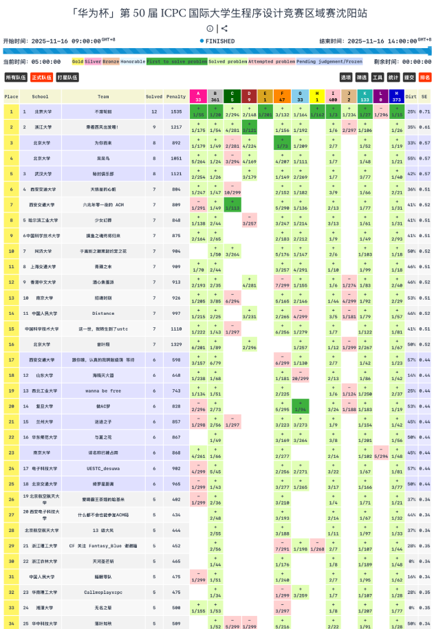 ICPC作为全球规模最大、影响力最广的大学生程序设计竞赛,采用ACM赛制,要求参赛队伍在5小时内共用一台电脑解决多道复杂编程问题,不仅考验选手的算法设计、编程实现能力,更对团队协作与抗压能力提出了极高要求。此次沈阳站赛事高手云集,竞争异常激烈,北京大学、浙江大学、武汉大学分别获得高校前三名。