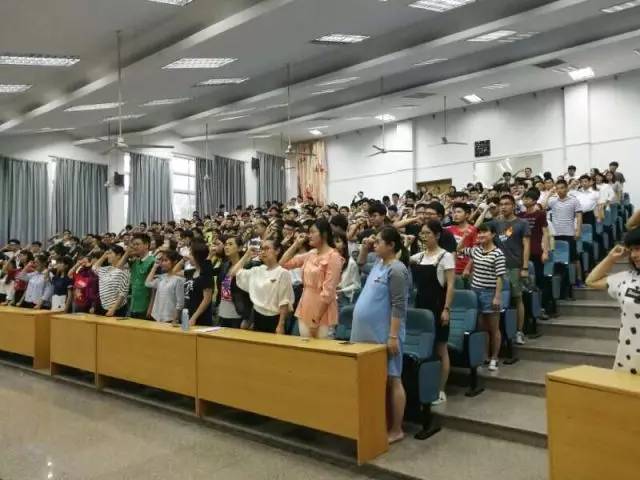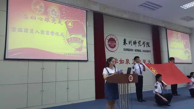 仪式由校团委书记傅志雄老师主持,在《光荣啊,共青团!》的歌声中拉开帷幕。在领誓人校团委副书记刘显新老师的带领下,面对着鲜艳的中国共青团团旗,同学们郑重地佩戴上了团徽,举起右手,庄严宣誓。接着任颖同学代表老团员做了发言,讲述了自己加入共青团的体会和成长经历,并对新团员的发展提出了一些建议;最后,傅老师对本次活动进行了总结,希望大家能弘扬五四精神,刻苦学习,树立远大理想,发挥团员先锋模范作用,无愧于胸前的团徽,以优异的成绩迎接党的十九大的召开。