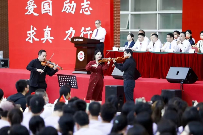 在开学典礼上,校长屈广清勉励全体新生要志存高远、心系家国,把大学作为青春的新赛道,将个人理想同祖国的前途和民族的命运紧密联系在一起,提高内在素质,锤炼过硬本领,以真才实学服务人民、贡献力量。当校长为典礼当天生日的8位新生送上生日祝福时,来自我院的美国归来的顾成博士和陈芳婷博士以及获得第六届福建省高校青年教师教学竞赛一等奖的叶晓龙老师,演奏小提琴曲目《生日快乐》歌,我院舞蹈学专业学生以优雅的舞蹈、音乐学专业学生以温暖的合唱为8位“小寿星”送上了最温馨的生日祝福。
