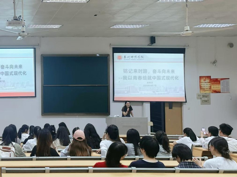 辅导员林伟芬开展“铭记来时路,奋斗向未来——我以青春绘就中国式现代化”专题宣讲。宣讲中,林伟芬以“来时路”为脉络,回溯中国式现代化的探索历程,从革命时期青年投身民族解放运动,到建设时期青年扎根戈壁荒漠搞建设,再到新时代青年在科技攻关、生态保护一线勇挑重担,通过“历史纵贯线+时代横截面”的叙事方式,让学生深刻认识到“中国式现代化不是轻轻松松、敲锣打鼓就能实现的,需要青年拿出‘初生牛犊不怕虎’的闯劲与‘敢教日月换新天’的干劲”。