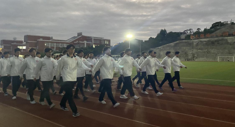 训练场上,新生们专注队列节奏,反复打磨动作细节;师兄师姐穿梭其间,及时纠正摆臂高度、踢腿角度等问题,展现出体院特有的“传帮带”传统。为追求整体协调一致,同学们顶着烈日反复操练,汗水浸透衣衫却无人言弃。一声声响彻云霄的口号,一次次精益求精的调整,都在诉说着体育人的执着与追求。