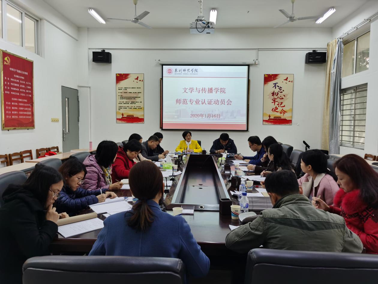 1月16日上午,文学与传播学院在学院会议室召开师范专业认证工作动员会,院领导王勇卫、李丽雪、杨秋生、刘文波、肖文清,各科室负责人以及中文系全体教师参加会议,会议由副院长杨秋生主持。