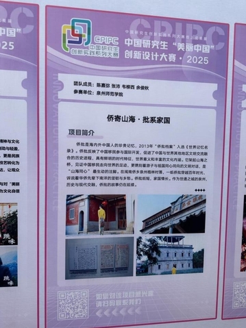 9月23日至24日,第三届中国研究生“美丽中国”创新设计大赛全国总决赛在黑龙江大学举行。2023级广播电视艺术硕士研究生陈嘉弥、张沛、韦柳西、余俊秋创作的纪录片作品《侨寄山海 批系家国》荣获全国二等奖。