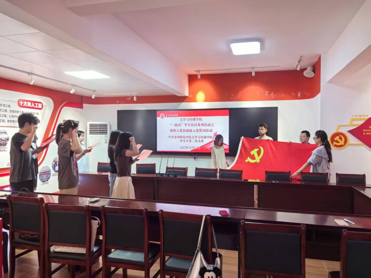 为进一步强化党员党性修养,增强新转入党员的责任感、使命感和归属感,10月12日晚,文学与传播学院学生社区兼合式党支部联合研究生第二党支部在C区13栋“一站式”学生社区新时代大学生文明实践中心庄重举行“重温入党誓词”主题党日活动。本次活动主要面向2025级新转入支部的6名党员同志。