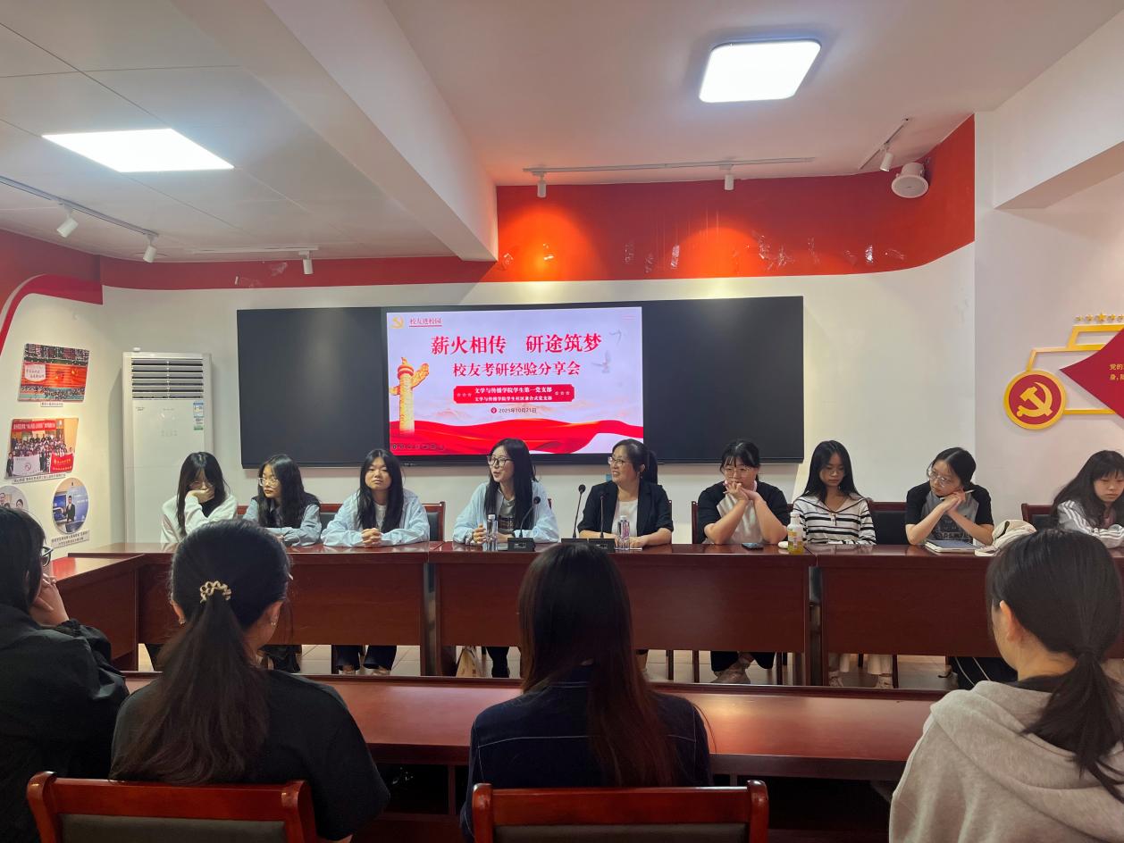 10月21日下午,在学生公寓C区13栋“一站式”学生社区新时代大学生文明实践中心,我院学生第一党支部、学生社区兼合式党支部举办“薪火相传 研途筑梦”校友考研经验分享会。19级优秀校友陈慧玲学姐为23级汉语言文学(师范类)专业的同学们分享宝贵的考研经验。
