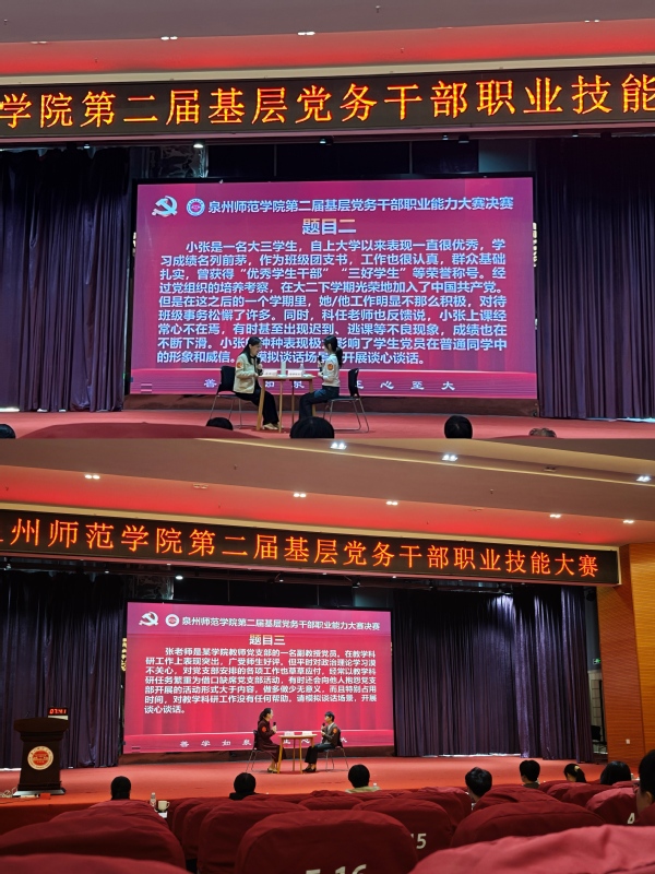 在决赛谈心谈话环节中,陈燕红作为谈话人,既坚守党性原则引领思想,又结合实际提出建议,情理交融彰显育人智慧;邱晓明作为被谈话人,精准呈现青年思想动态,展现教师党员优良的综合素质。两位参赛队员的生动表现,诠释谈心谈话这一“传家宝”在开展经常性思想政治工作和日常管理中的关键作用,赢得了现场观众的阵阵掌声。