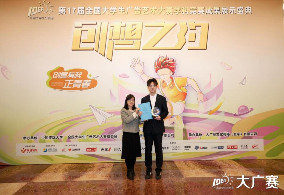 近日,第17届全国大学生广告艺术大赛(以下简称“大广赛”)成果展示盛典与华彩20周年颁奖盛典相继在北京全国政协礼堂隆重举办。我院再传捷报,广告学(闽台合作)专业学生阮榆琪、戴梓杰在指导老师李玉秀的悉心指导下,《喂?胃!——三九胃泰牌养胃舒》荣获广播类作品“全国二等奖”。