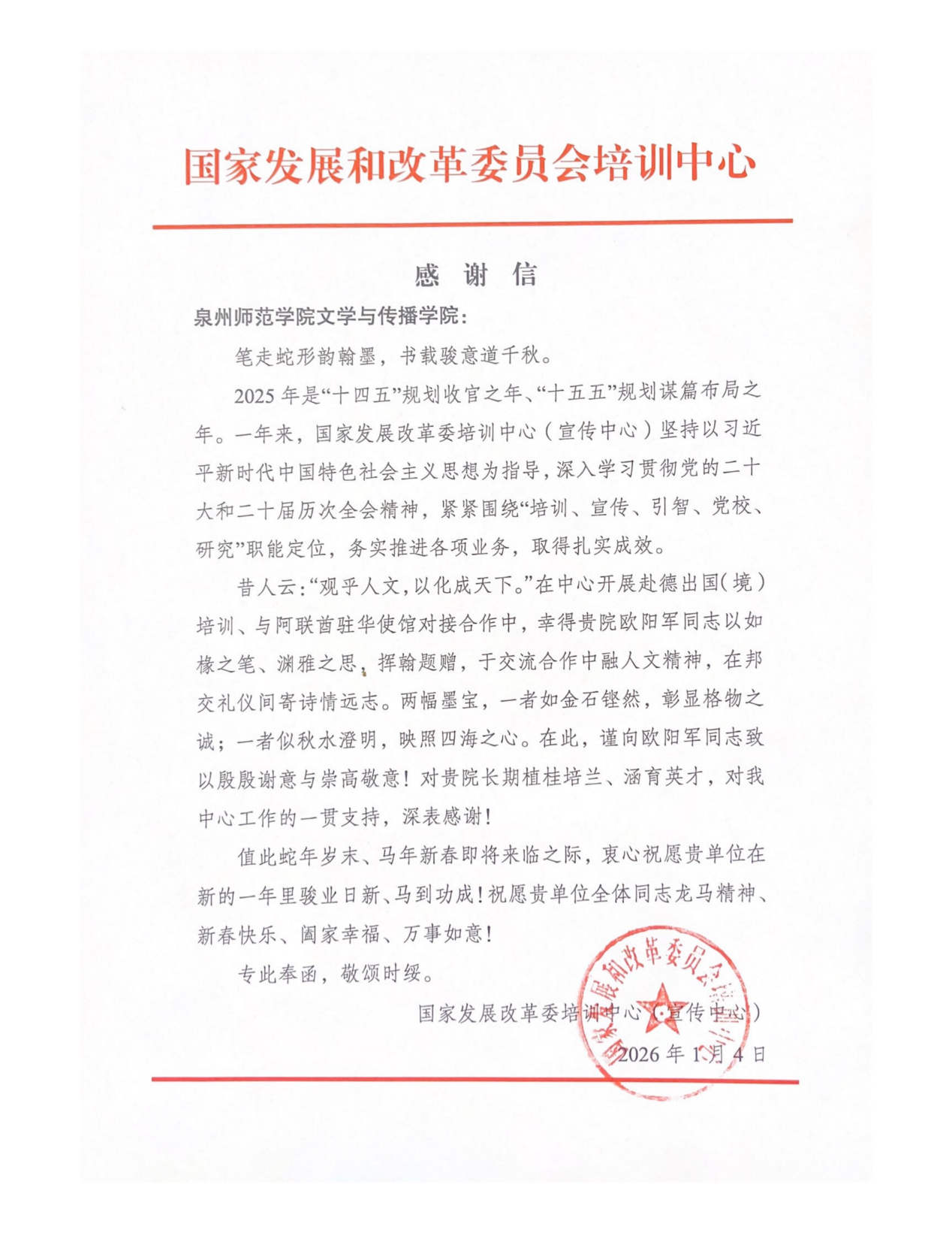 近日,国家发展改革委培训中心(宣传中心)专函泉州师范学院文学与传播学院,致谢书法系欧阳军老师以书法艺术赋能国际交流、助力文化传播的突出贡献表示高度赞赏,彰显了中国传统文化在国际交往舞台上的独特价值与桥梁作用。